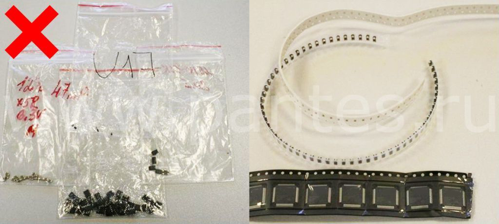 Комментарий: компоненты в виде россыпи или отрезков ленты не установить на оборудование для автоматического монтажа. Необходима ручная установка, которая ведет к удорожанию монтажа и увеличению сроков выполнения заказа.